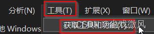 2.安装相关工具集(C++开发工具及VS生成工具),打开visual studio,依次点击”工具”, ”获取工具和功能”