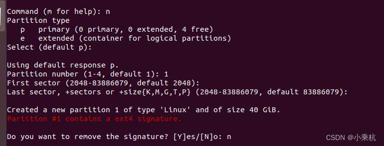 6、使用n进行新的挂载点分区,问我要分几个区,我告诉他分一个;起始位置默认回车;