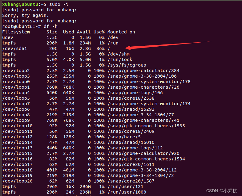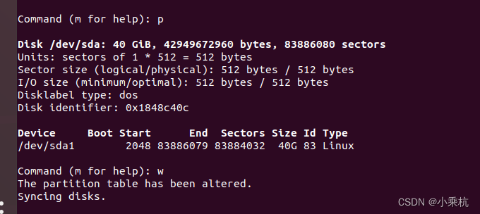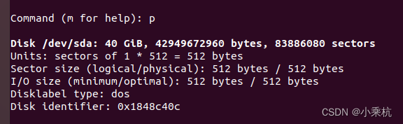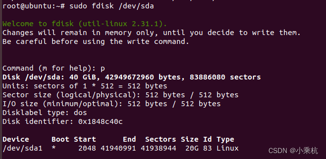 p查看当前分配虚拟磁盘空间;和之前挂载位置在/dev/sda1