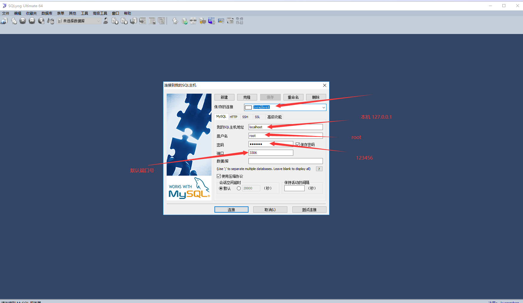 数据库连接方式1:先启动MySQL,打开SQLyog进行连接