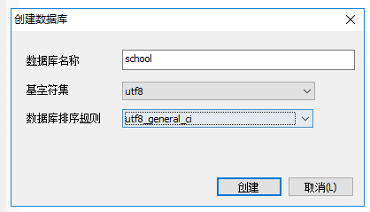 输入数据库名称(school)、基字符集(utf8)、数据库排序规则(utf8_geneal_ci