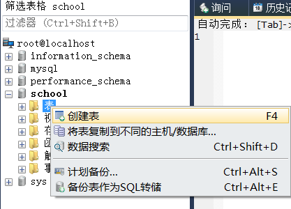 打开school数据库,在“表”上单击右键,创建表