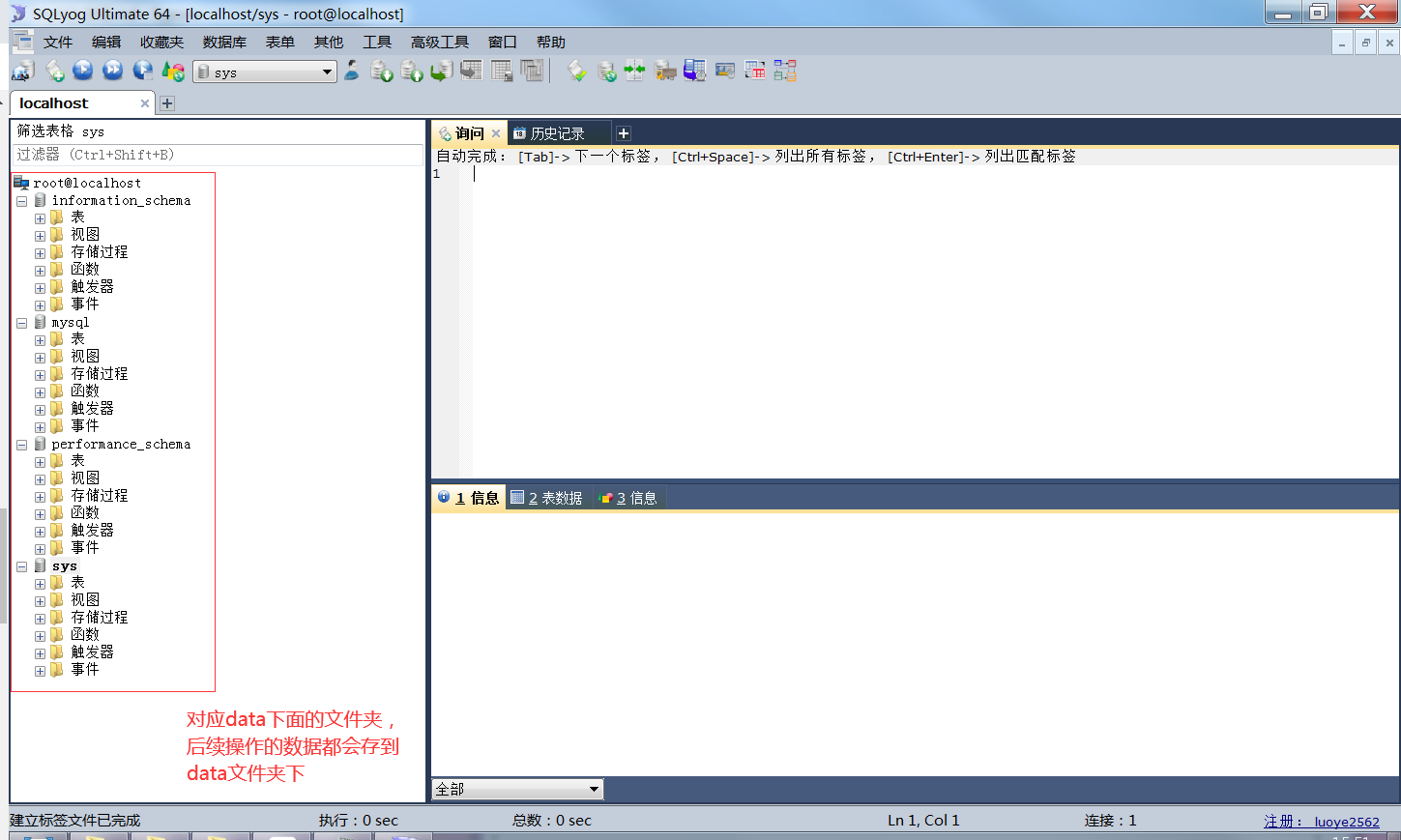 右侧上方为SQLyog代码编写区域,Ctrl+鼠标滚轮可调整字体大小,可通过“历史记录”查看之前输入过的命令