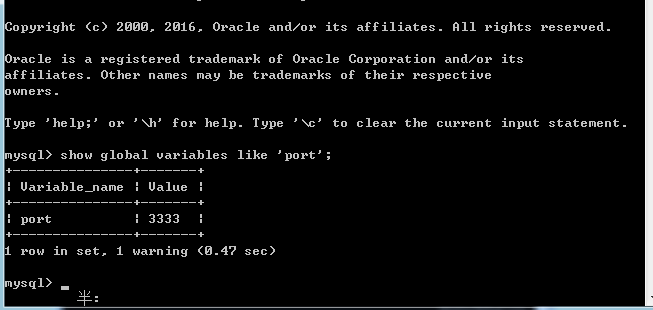 启动MySQL,在MySQL的cmd下输入:show global variables like 'port';