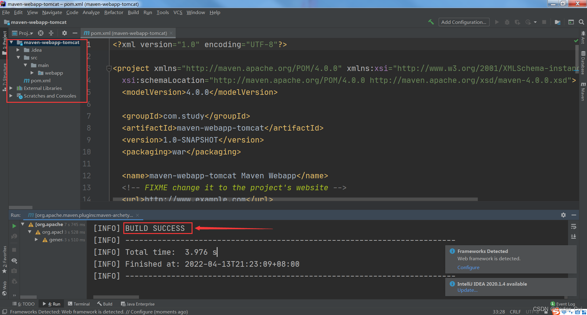 控制台出现BUILD SUCCESS表示项目Maven-webapp项目创建成功。
