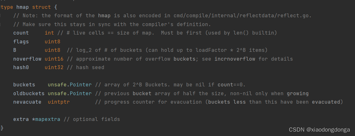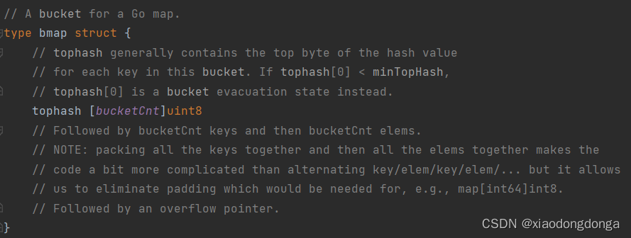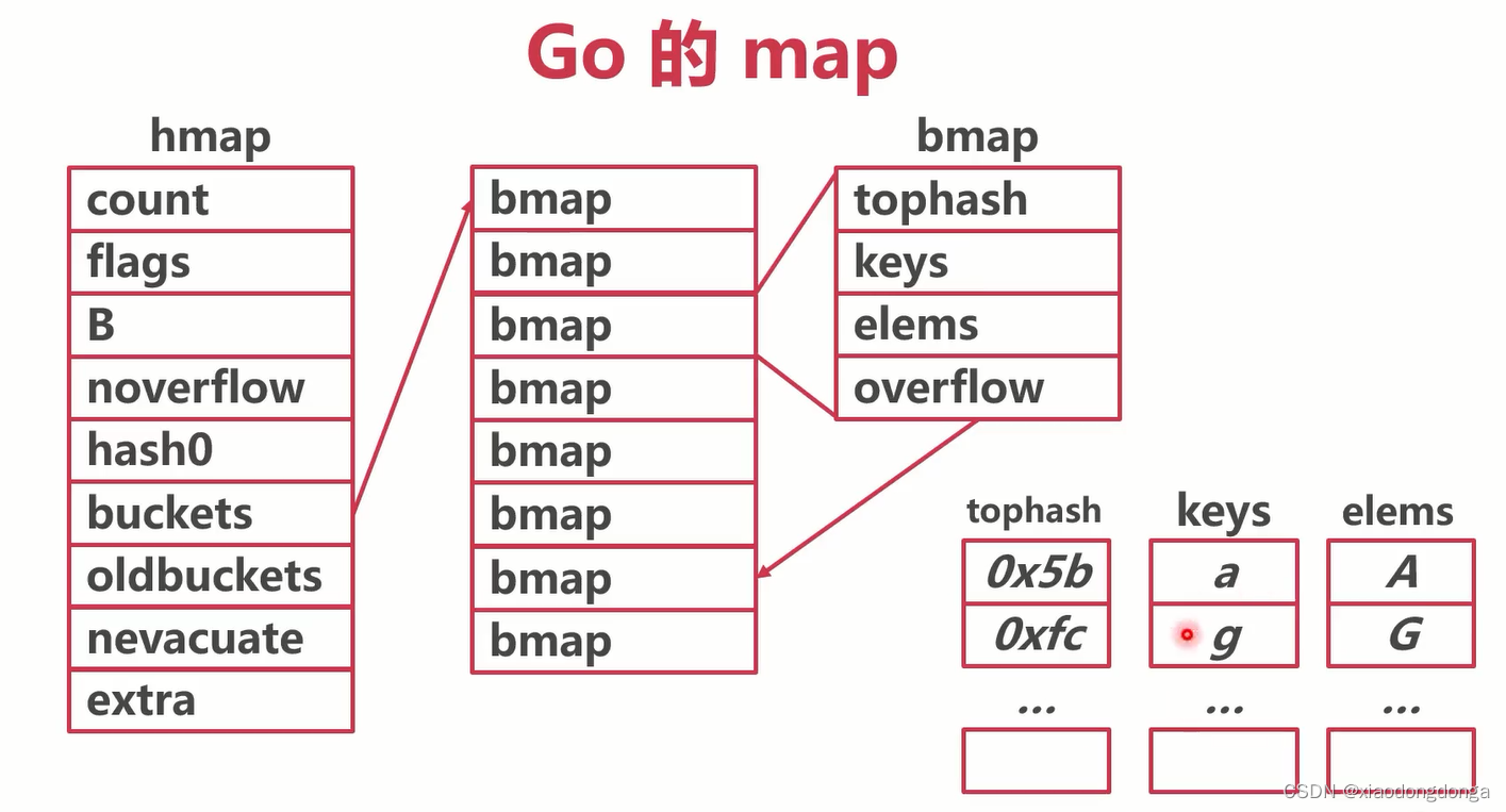 那么这个overflow是什么呢?其实就是溢出桶,因为一个桶只能放8个数据,那么当哈希碰撞严重的时候,就只能挂个溢出桶了。溢出桶会在map建立时自动生成。