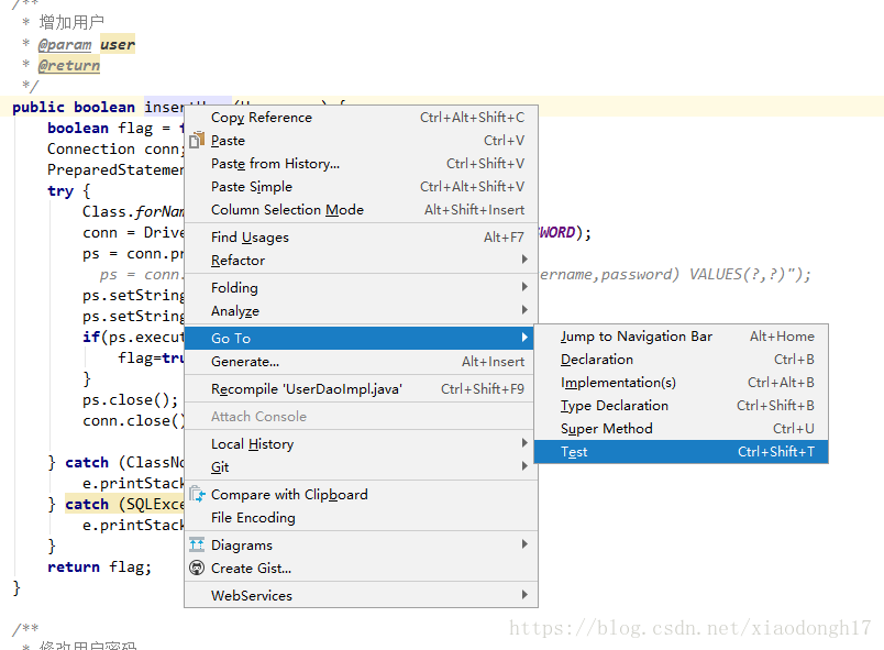 鼠标放在实现类方法上面,右键,如上图所示操作,或者直接Ctrl+Shift+T,创建测试类: