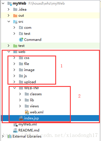 其中方框1所示部分属于前端的代码,这里就不再讲解。我们只看方框2部分的代码,也就是WEB-INF目录下的文件:其中classes文件里面都是前三步准备工作中代码执行之后生成的class文件。lib文件夹需要你手动去创建,主要用来放项目所需要的jar包,记得添加进去以后,右键add library。然后就来到了views文件夹: