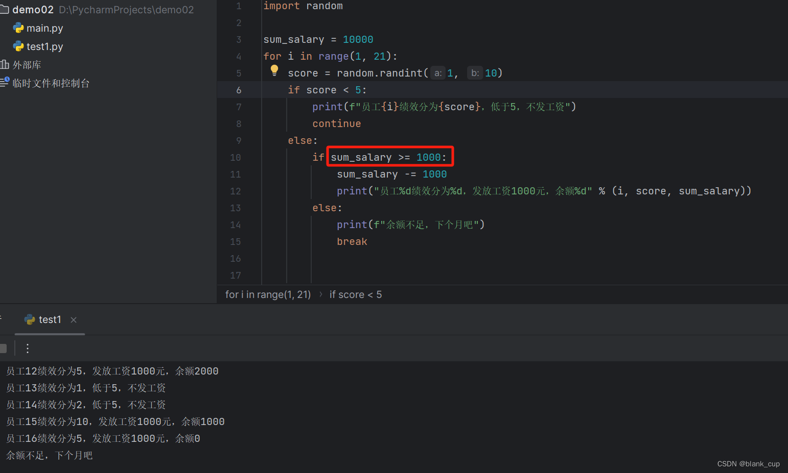 发工资案例,银行卡总共10000元,给20名员工发放工资,绩效低于5分不发工资,满足绩效每位员工1000元,余额不足后提示下个月再发放