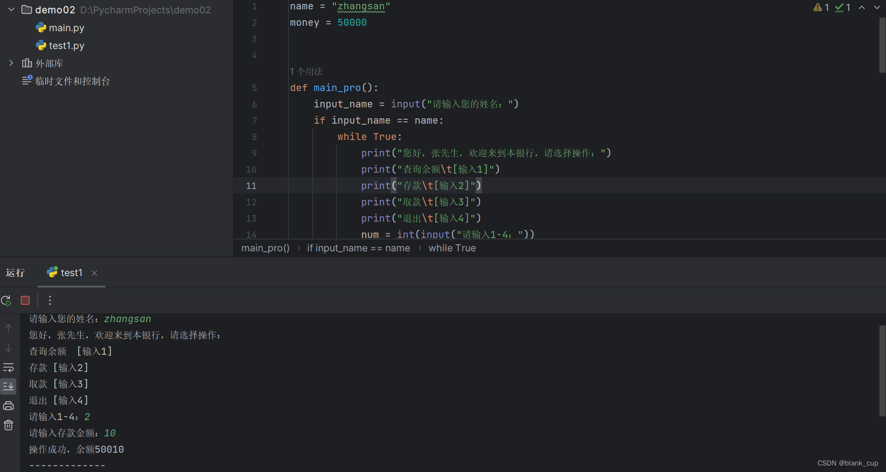 而且还有冗余代码,即取款存款结束后可以调取查询函数查询余额。