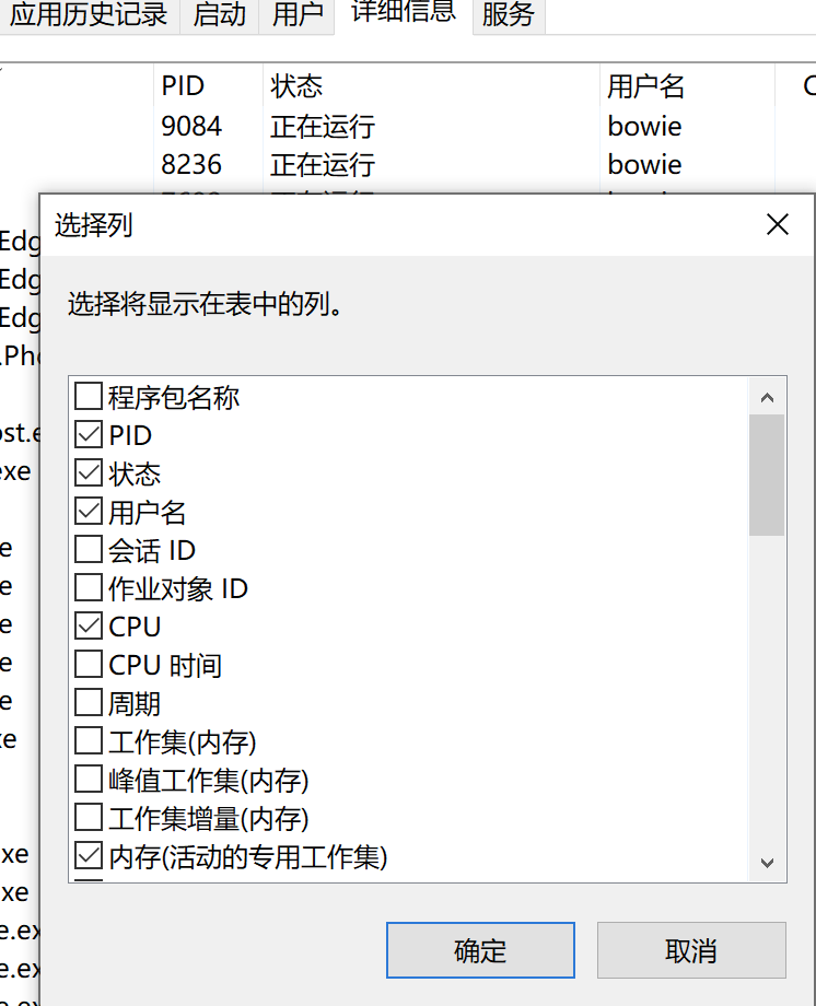 在详细信息栏中可以也可以查看进程的信息,右键点击第一行可以选择显示的项目: