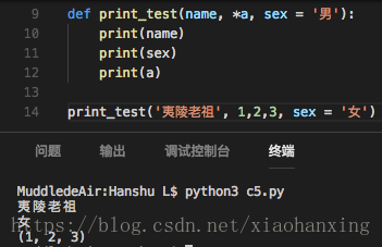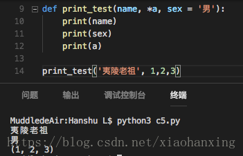 注:参数有可变参数,也有默认参数时,调用函数时,若要改变默认参数的值应使用关键字参数的方式给默认参数赋值,如: