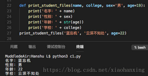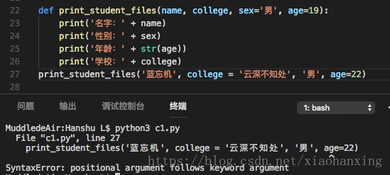 此时使用的是关键字参数,关键字参数可以不用考虑参数的排序,因为指名了给哪个参数赋值