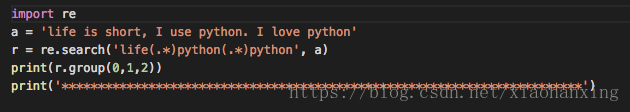 运行结果:('life is short, I use python. I love python', ' is short, I use ', '. I love ')