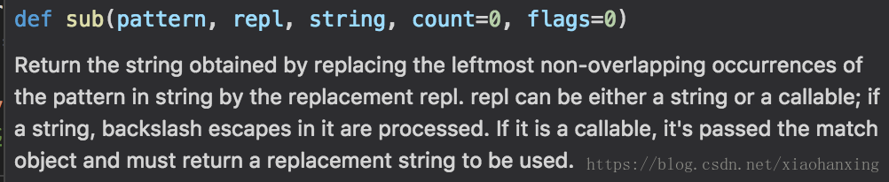 re.sub方法共有5个参数,最后两个为可选参数,count代表匹配后可以被替换的最大的次数,flags匹配模式