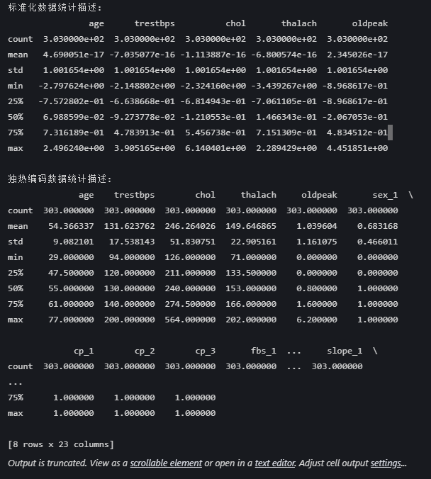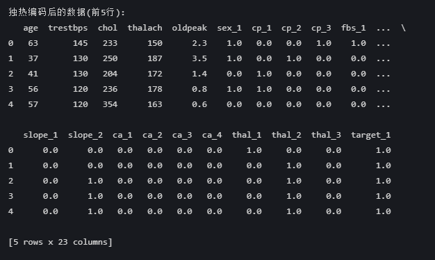 - 每个分类变量被展开为多列(如cp→cp_1,cp_2,cp_3)