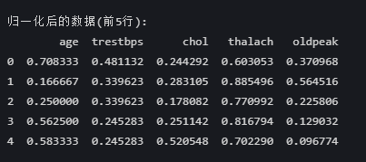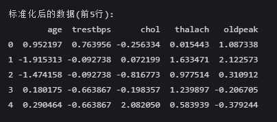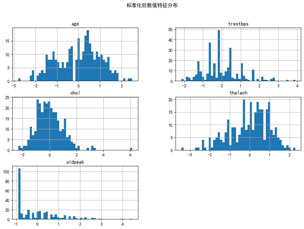 - 所有数值列(age、trestbps等)均被Z-score标准化