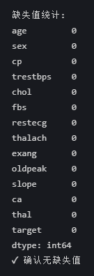 缺失值统计结果为0是完全正常的,这说明你的 heart.csv 数据集非常完整,所有特征都没有缺失值。这是理想的情况。
