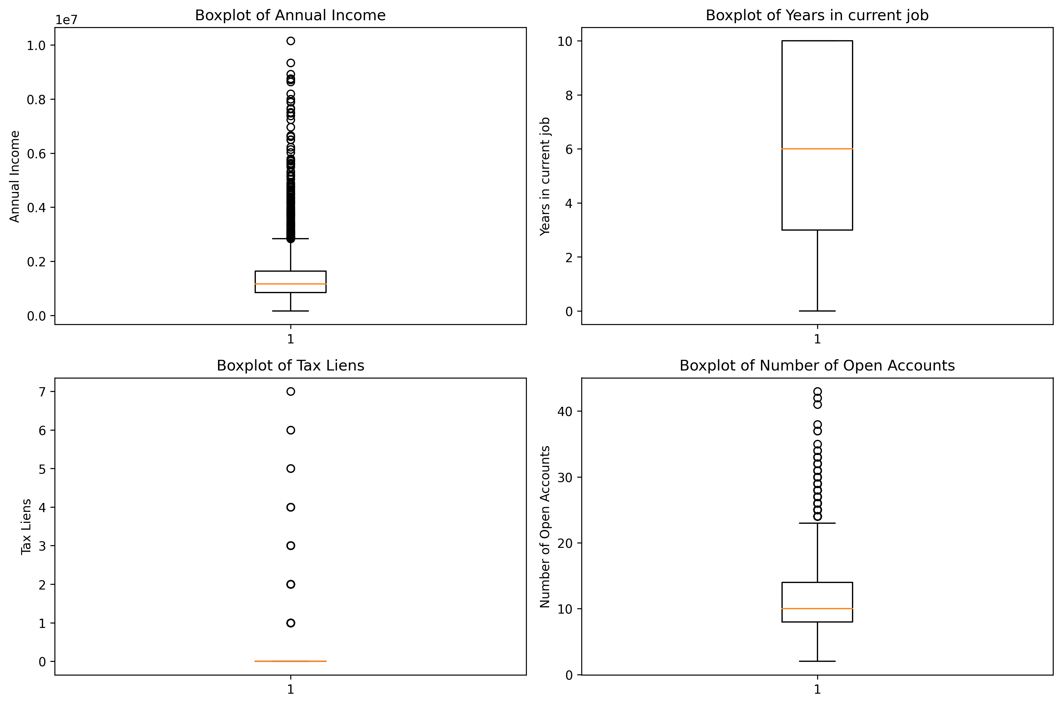 features = ['Annual Income', 'Years in current job', 'Tax Liens', 'Number of Open Accounts']