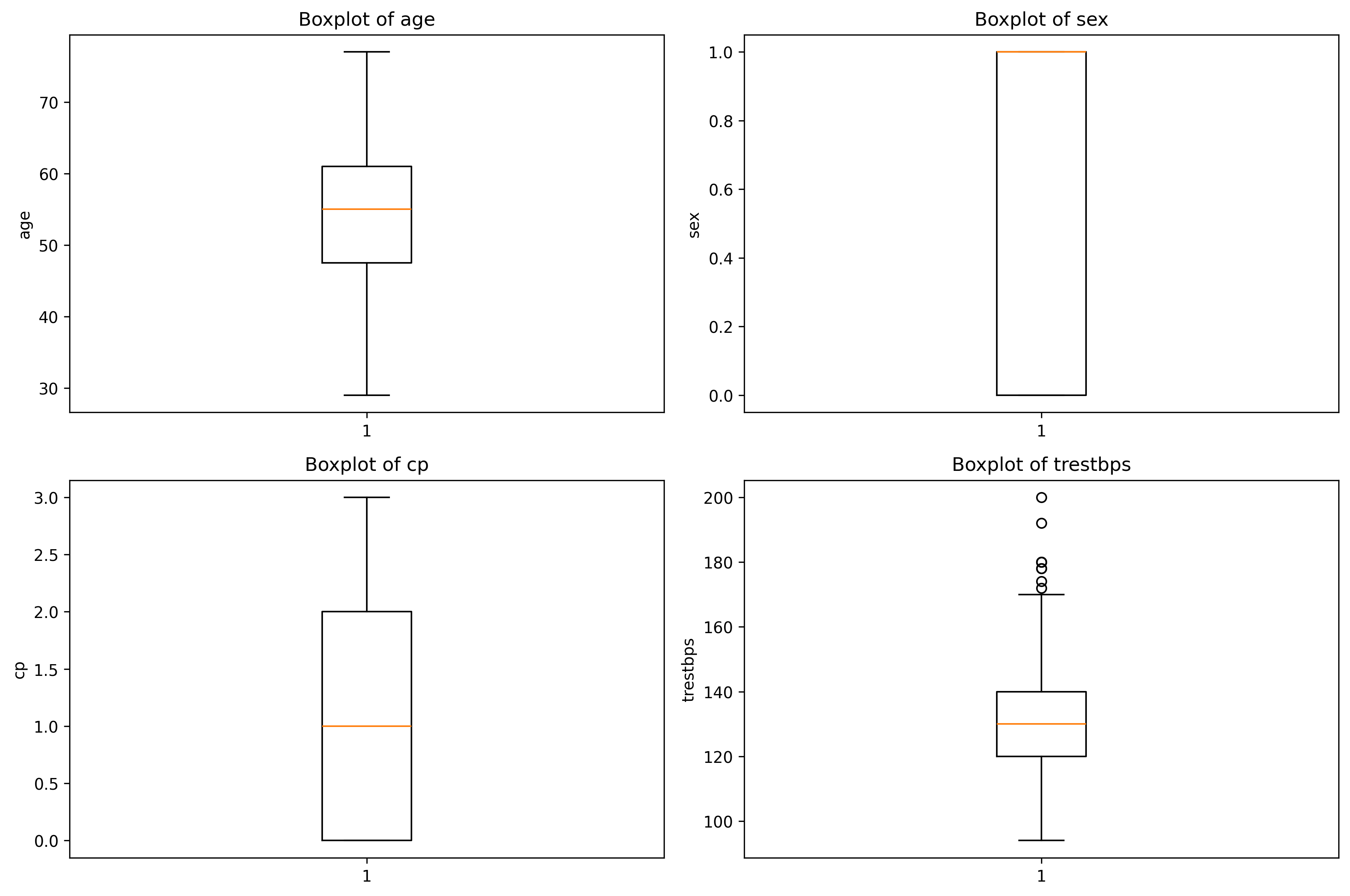 for feature in ['age', 'sex', 'cp', 'trestbps']: