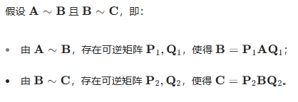 定义:如果矩阵A可以经过若干次初等行或列变换变成矩阵B,那么称A与B等价。