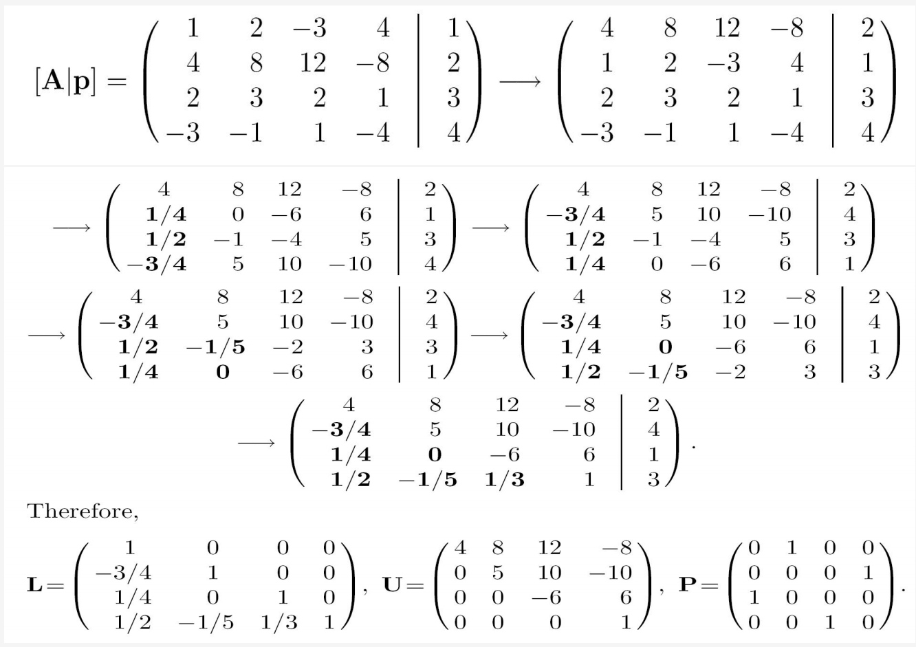 至此,已经通过高斯消去完成了一个上三角矩阵,LU分解结束。这里计算时需要注意,黑体所写的并不是矩阵中实际的元素,只是记录高斯消去的系数方便我们写出L矩阵,它们实际上都是0。P矩阵应该是很容易根据p向量观察出来的。