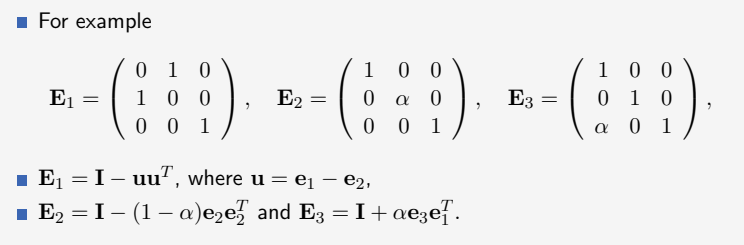 下面的两个公式是对初等矩阵进行分解,变为可以套用上一节介绍的公式(矩阵和的逆)的形式。