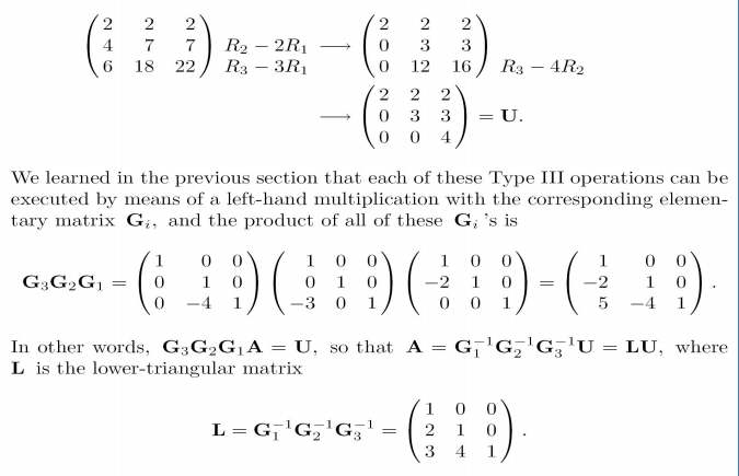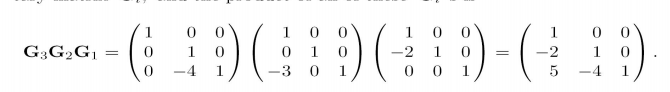 这里大家可以自己计算一下(我们前面讲了如何快速求初等矩阵的逆),可以发现结果恰好是一个下三角矩阵(其实可以证明,任意下三角矩阵的乘积仍然是下三角矩阵,上三角也同理,这个是第一次作业的题)