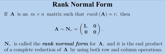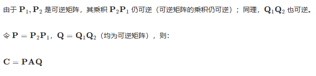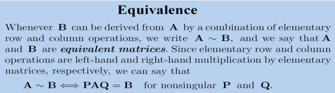 我们由高斯-约当消去法(就是解线性方程组,先化成上三角再把主元所在列的其余元素变为0的那个)可以知道,如果矩阵A的秩为n,那么这个矩阵一定等价于它的秩标准型,其中