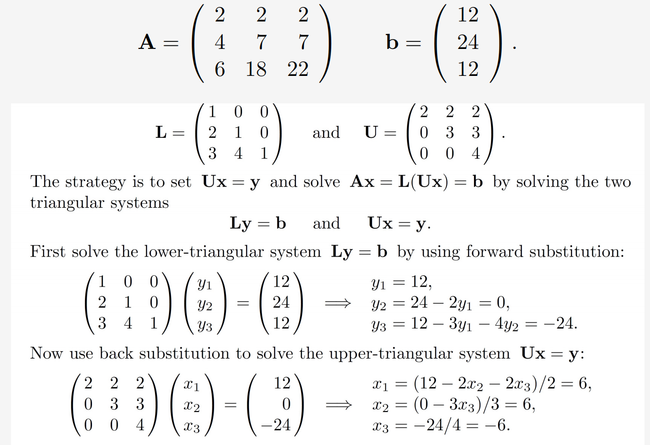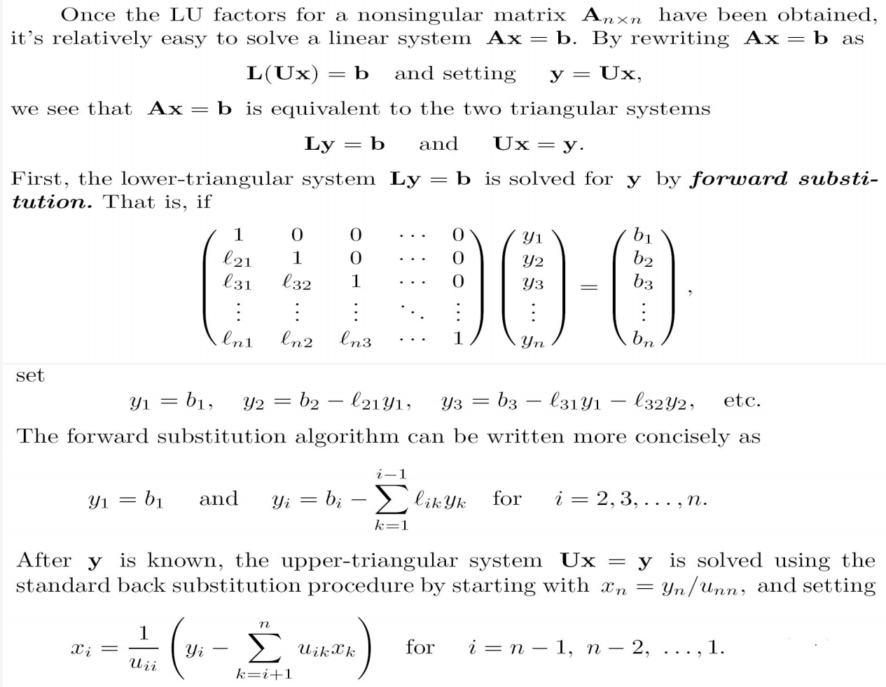 LU分解可以很好的求解线性方程组,因为上(下)三角矩阵都可以不通过消元来直接得出解:
