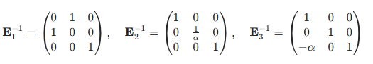 上图E2,它的作用(左乘:将第二行变为原来的α倍),如果希望它变成单位矩阵,只需要左乘一个和它一模一样的矩阵,只不过把中间的α换成1/α,也就是说