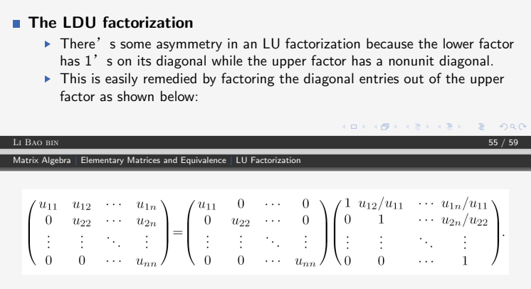 其实没什么可讲的,它是 LU 分解的一种对称化形式,把一个矩阵变成单位下三角矩阵,对角矩阵,单位上三角矩阵,一看就明白。