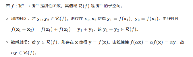线性函数的值域(记作)就是一个矩阵的列空间,简单证明一下线性函数运算的封闭性: