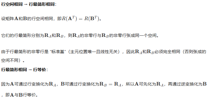 证明逻辑在于行最简型的唯一性,而行最简形的非零行向量是原矩阵行空间的一组基。行空间相同的矩阵,其行最简形必相同,因此可通过行变换互相转化。零空间相同的矩阵,其行最简形也相同,因此行等价。