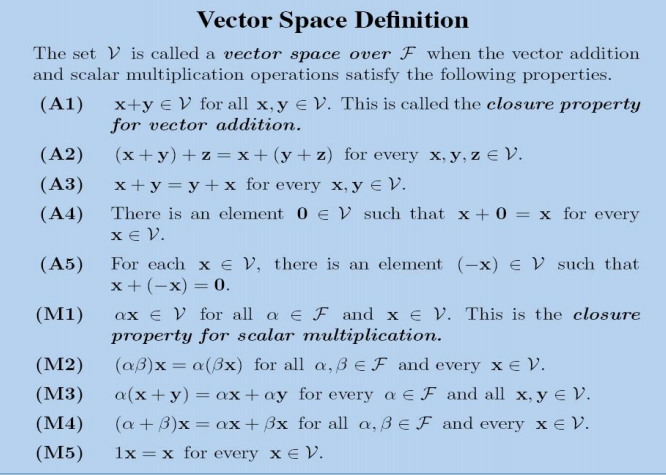 如果这个集合中的所有向量都满足以上10条要求,那么这个集合中的所有向量构成了一个向量空间,下面总结一下这10个要求: