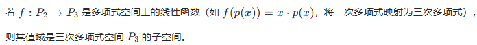 线性函数的值域是其陪域(codomain) 的子空间。陪域是指一个函数(映射)中,目标元素所在的集合,简言之,陪域是函数 “可能输出” 的集合范围,值域是 “实际输出” 的集合(是陪域的子集)。例如: