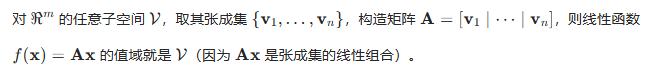 我们可以发现,子空间和线性函数值域是等价的。这里还有一个问题,线性函数值域和子空间等价,那么和谁的子空间等价呢?这里是一个我之前不太了解的概念,这里以我的理解简单分享给大家: