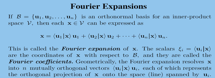 上一节的最后是标准正交基,其需要满足各个向量之间正交且范数为1,接下来讲标准正交基的重要应用——傅里叶展开与施密特正交化。