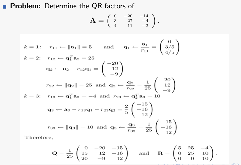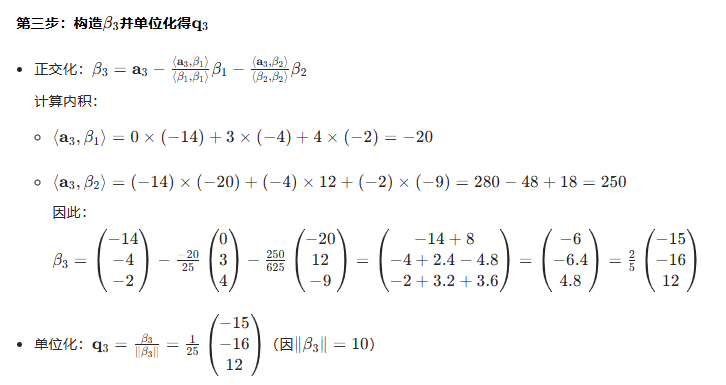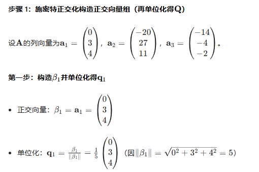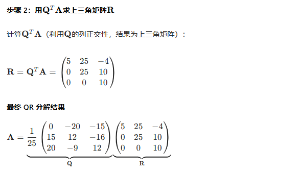 可以先用施密特正交化求解出Q矩阵,由于Q是正交矩阵,其逆矩阵就是它的转置,因此,直接用Q的转置乘上A即可得到R矩阵。这种方法和上图本质上是一样的,只不过上图是一个一个算,这种方法是一起求出,对于手算来说更方便一些。