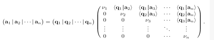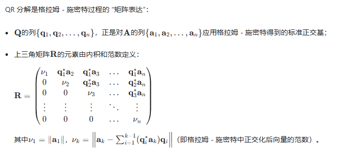 这里,我们实际上把一个矩阵分解为了正交矩阵Q,和上三角矩阵R。