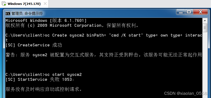 #命令的意思是:创建一个syscm2(SuperCMD)服务,服务的binPath路径等"cmd /K start"(启动一个CMD)
