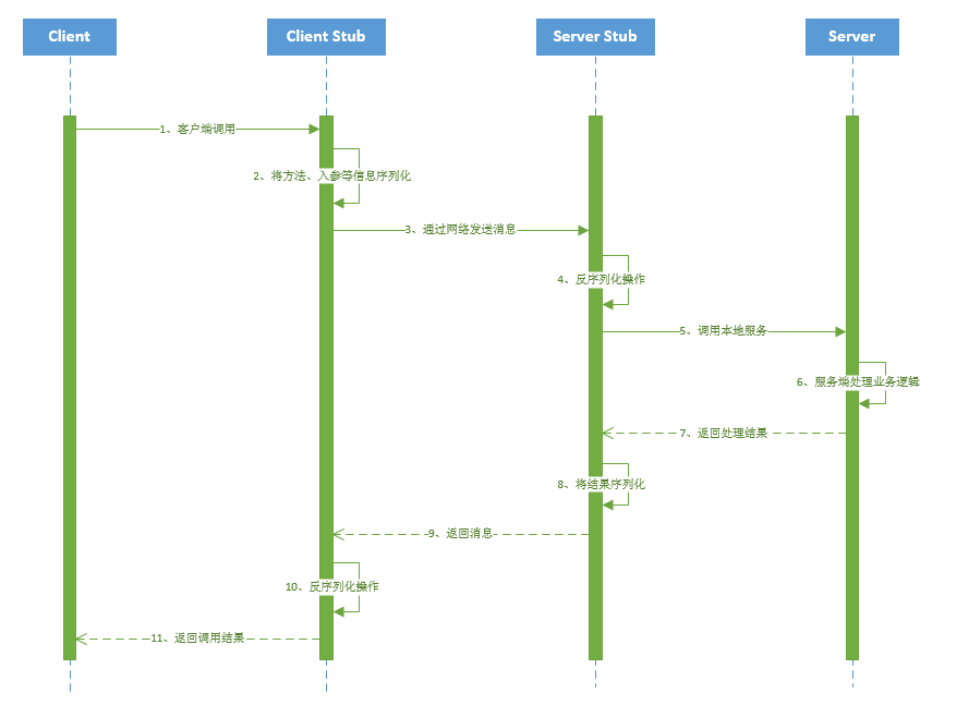 服务端存根(server stub)将返回结果重新打包成消息(序列化)并通过网络发送至消费方;