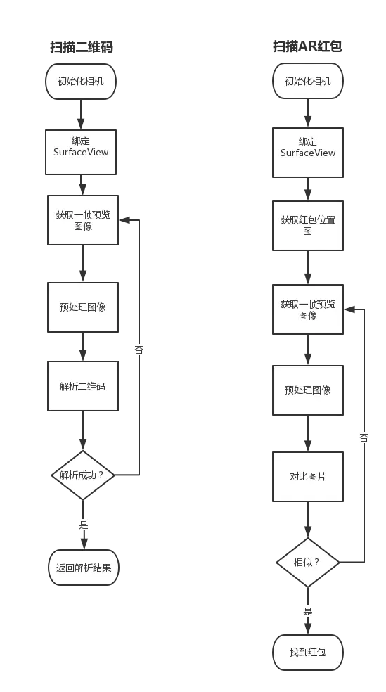 首先我们对比下扫描二维码和扫描AR红包的实现原理:
