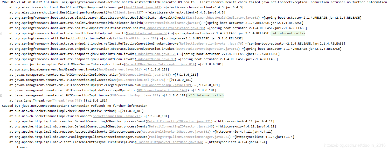错误日志:org.springframework.boot.actuate.health.AbstractHealthIndicator 89 health - Elasticsearch health check failed java.net.ConnectException: Connection refused: no further information