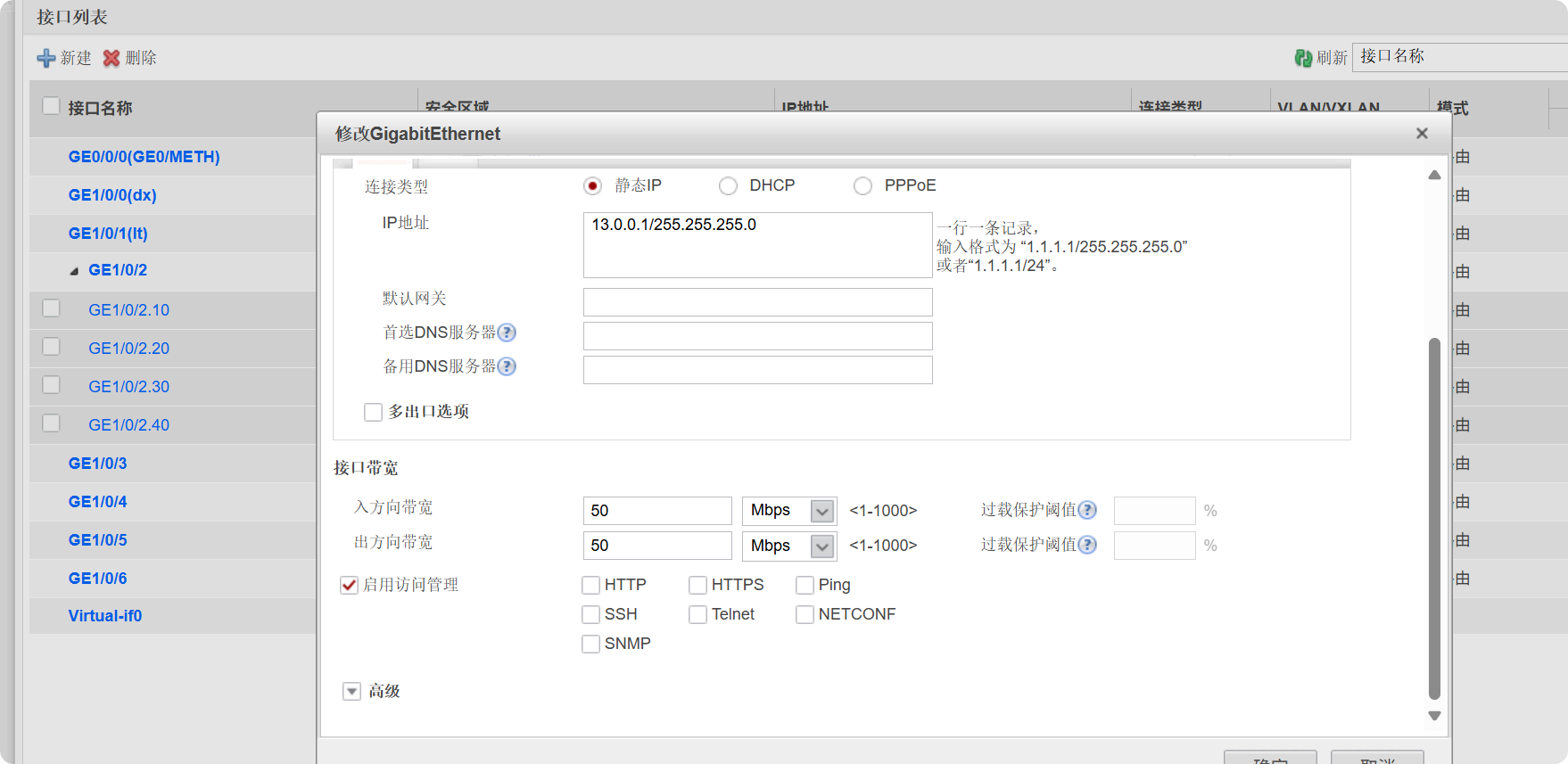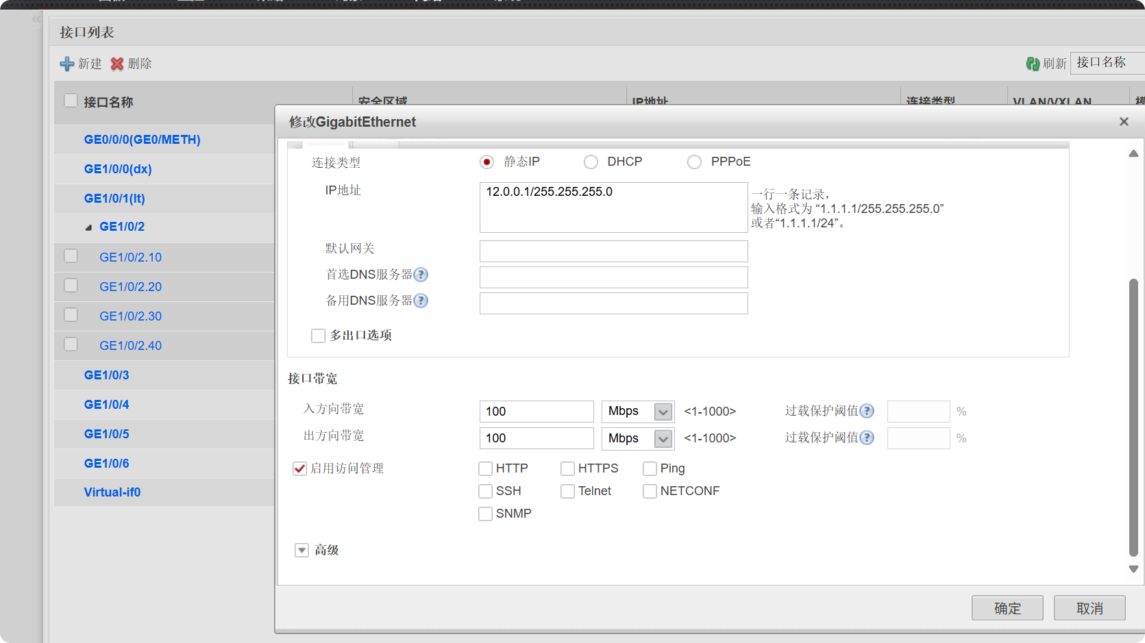 [dianxin-GigabitEthernet0/0/0]ip address 12.0.0.2 24