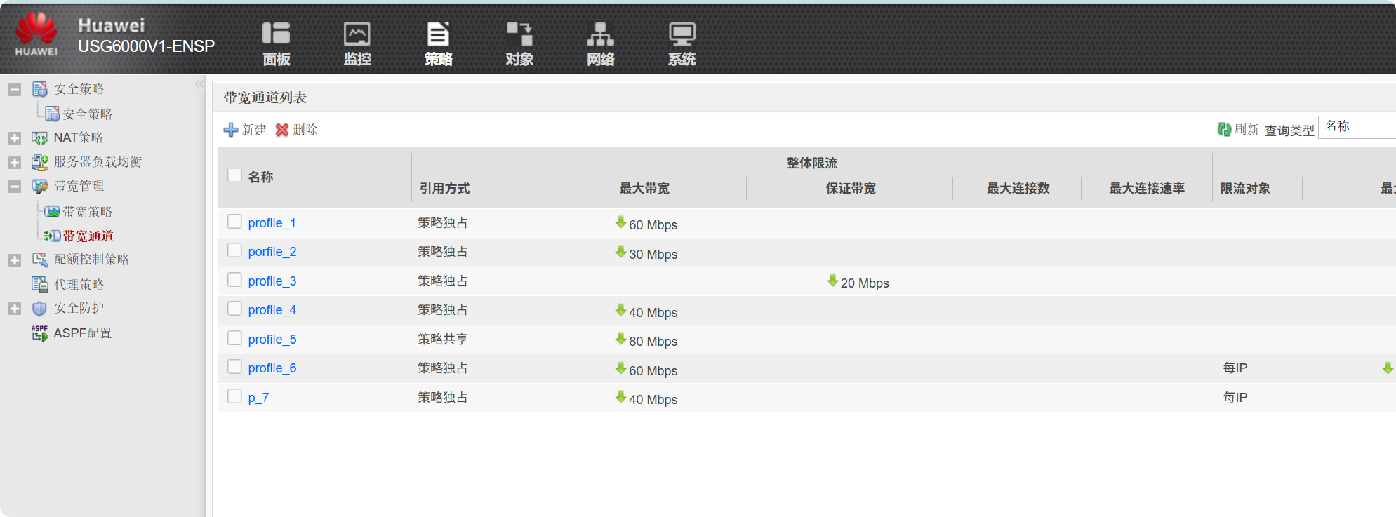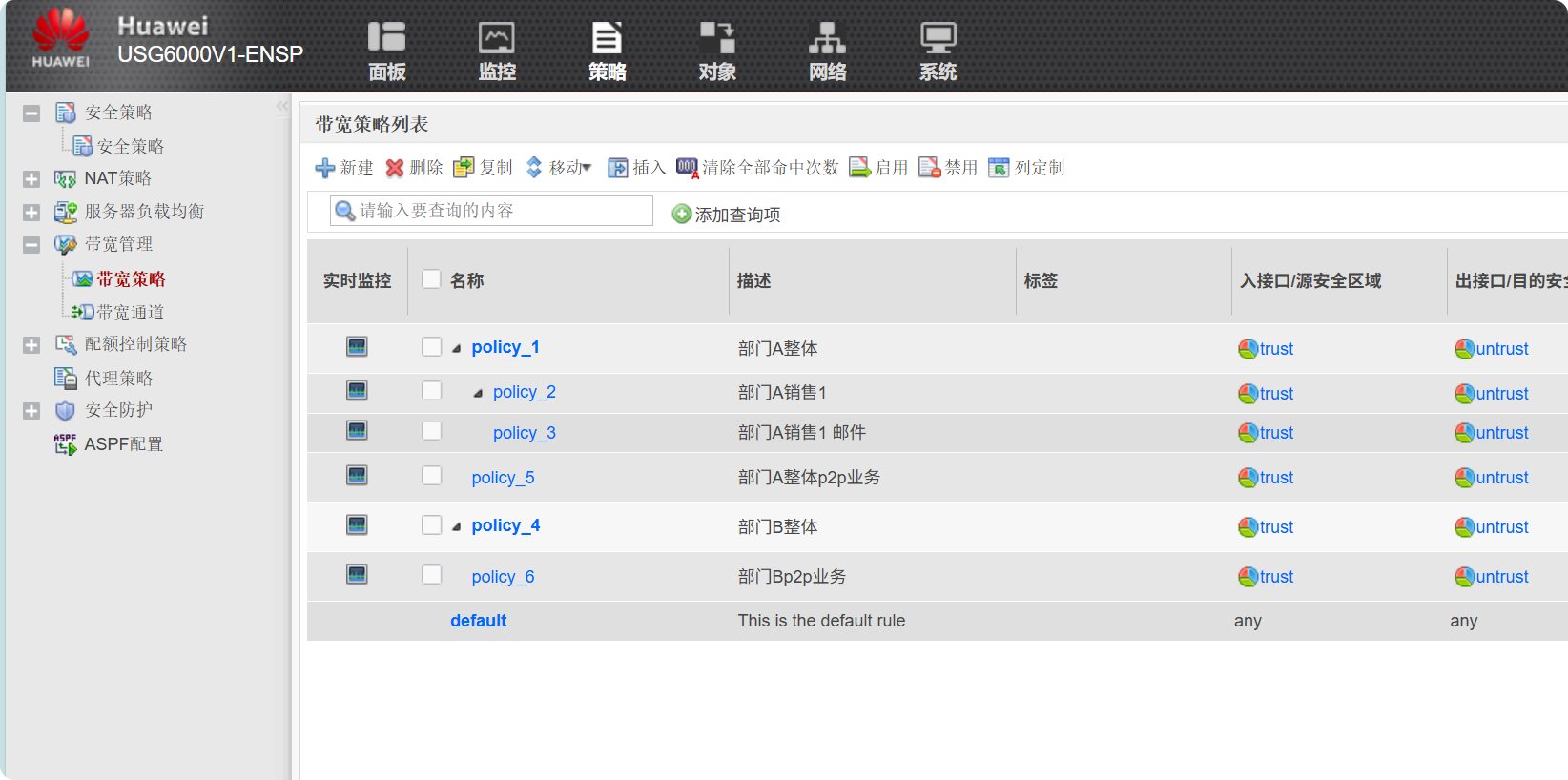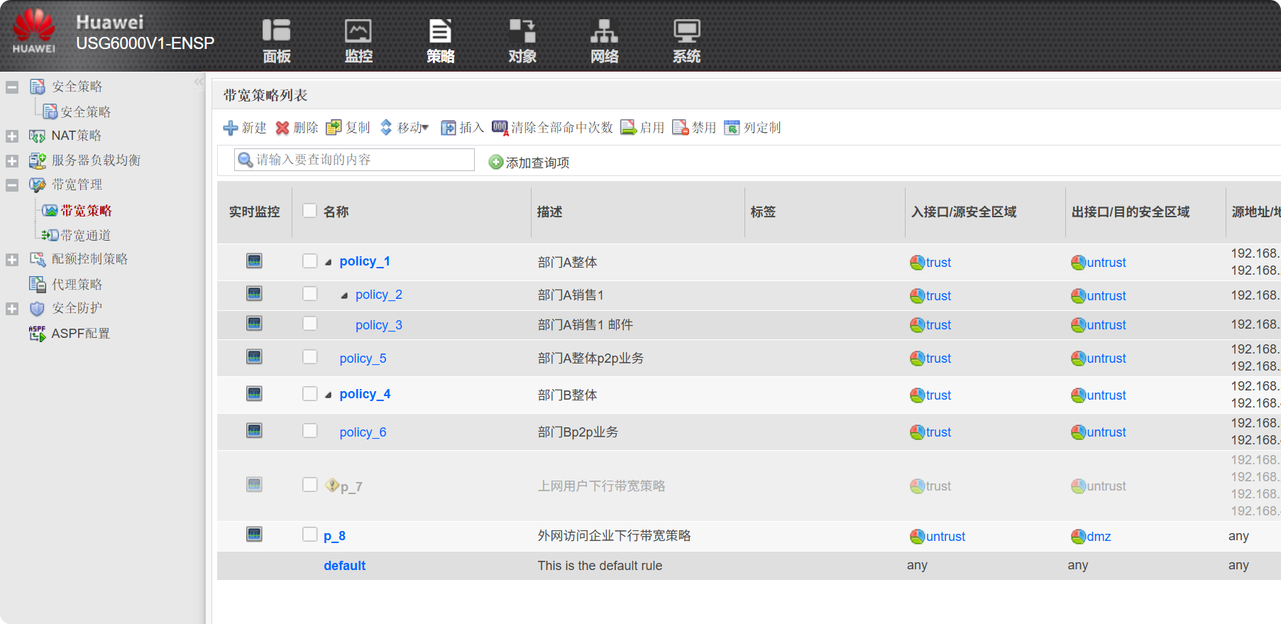 分别配置基于P2P应用的带宽策略 --- 各自与部门A和部门B的带宽策略建立父子关系