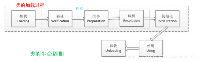 类的生命周期包括这几个部分,加载、连接、初始化、使用和卸载,其中前三部是类的加载的过程